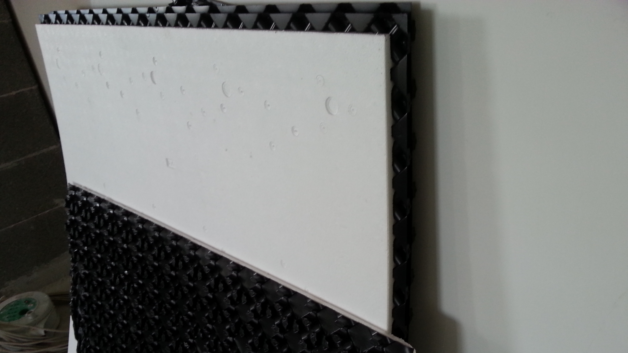 Un pavimento radiante inizia da pannelli un po’ quasi come a sandwich, composti da una lastra di isolante (la parte in bianco) e una lastra fondamentalmente in plastica (la parte in nero).