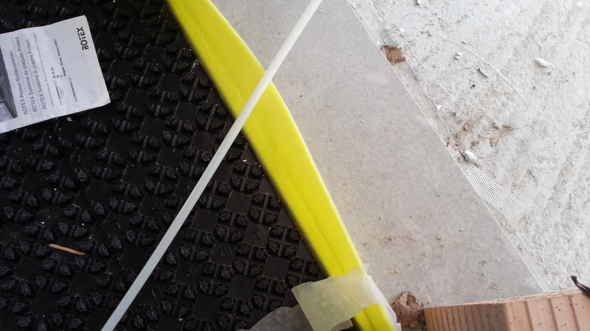 I pannelli vengono adagiati su tutta la superficie della stanza (attenzione, tutti i fori di alloggiamento devono essere allineati), e tutto intorno si inserisce la fascia perimetrale (oltre che a dare un isolamento di tipo termico), che protegge e contiene dal getto liquido del massetto.