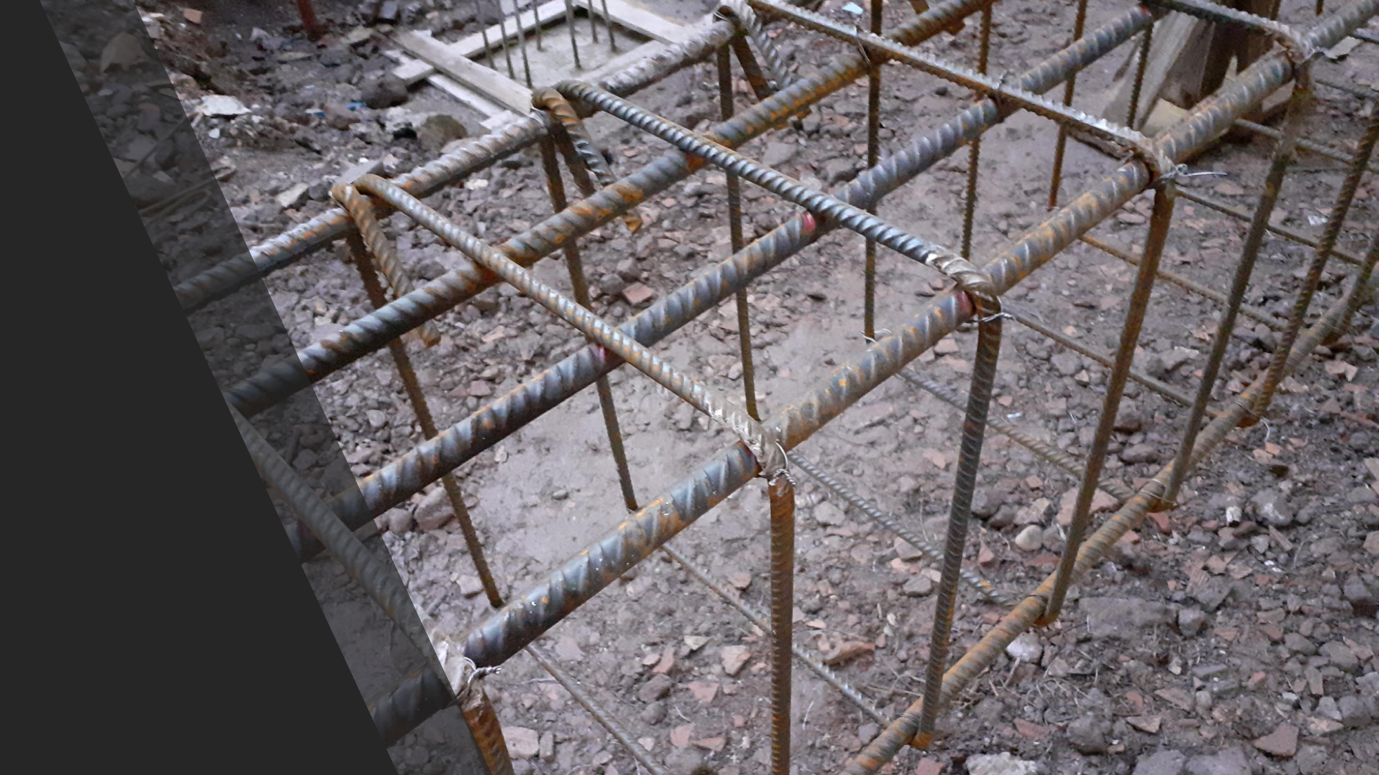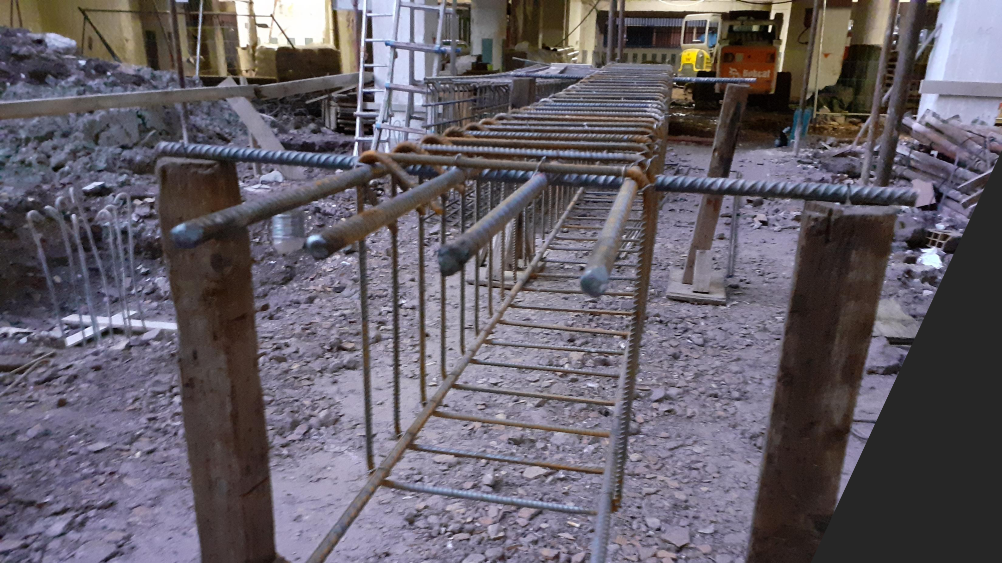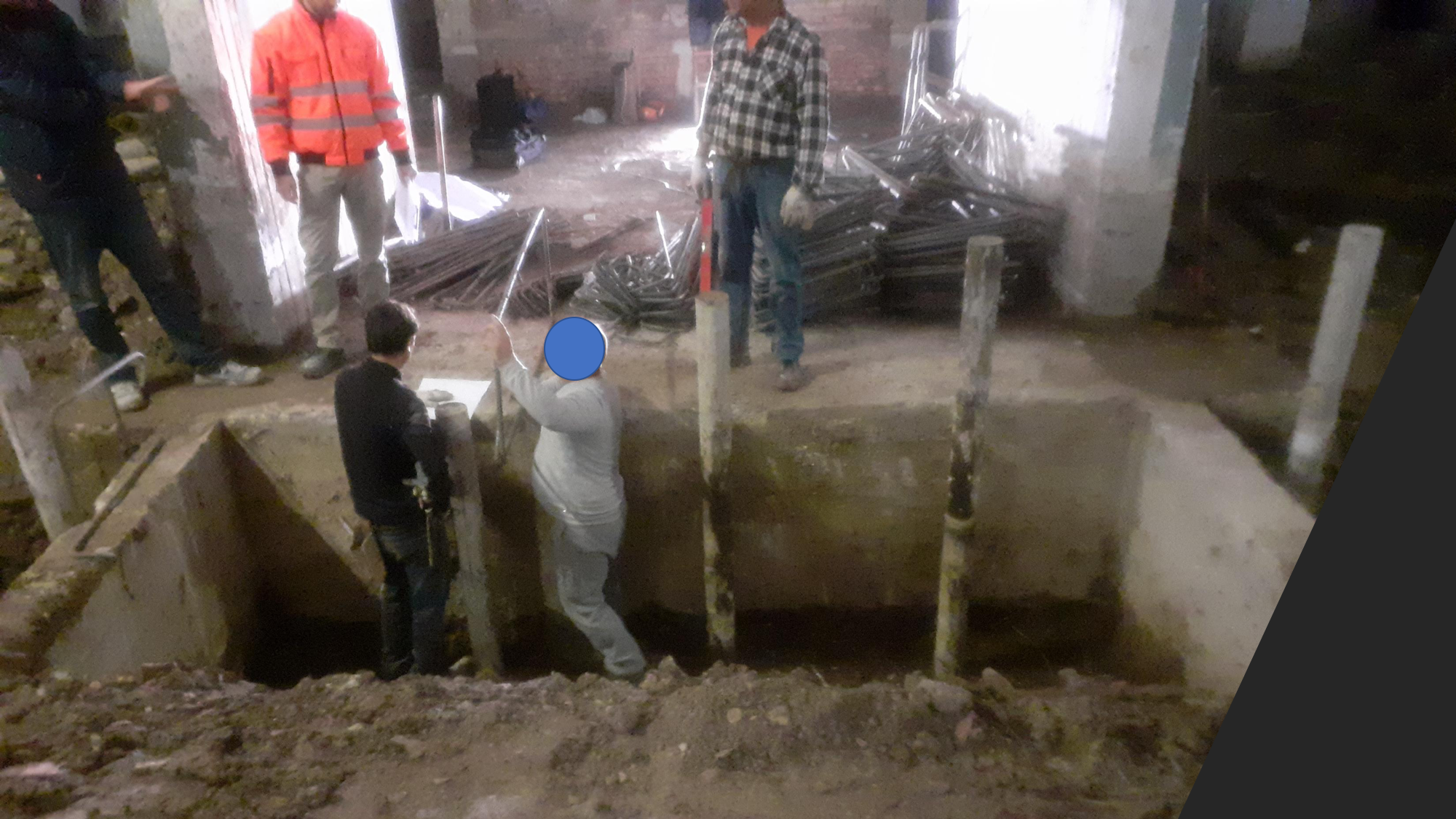 Quello che andiamo a fare è inserire un plinto di fondazione a rinforzo della fondazione esistente. Dentro quella vasca, che vedi con i 3 pali di fondazione, va inserita una gabbia di armatura che fuoriesce dalla vasca per oltre 40cm.