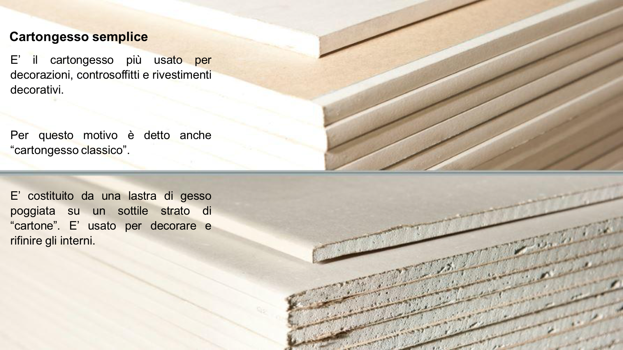 Quello che, sicuramente, ti è capitato di vedere è il cartongesso semplice. È molto usato per gli interni, per controsoffitti e rivestimenti decorativi (detto anche cartongesso classico).