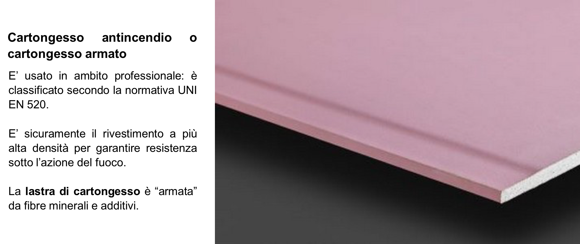 Parliamo del cartongesso antincendio o armato. Presenta un rivestimento ad alta intensità, che garantisce una resistenza maggiore al fuoco. La lastra di cartongesso, quindi, viene armata di fibre minerali e additive che la rendono ignifuga.