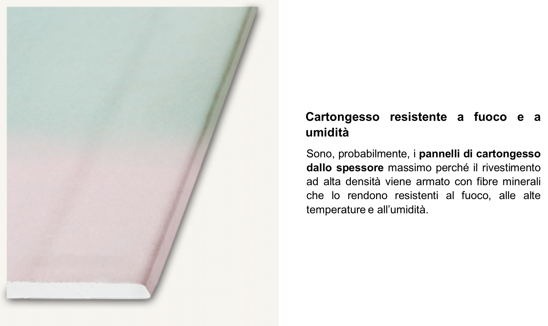 Esiste un pannello ibrido, che resiste sia al fuoco che all’umidità, in quanto armato con fibre minerali. La colorazione è mista, ma non è quella che ne determina la proprietà, perché il colore serve solo a distinguere facilmente i pannelli in cantiere.