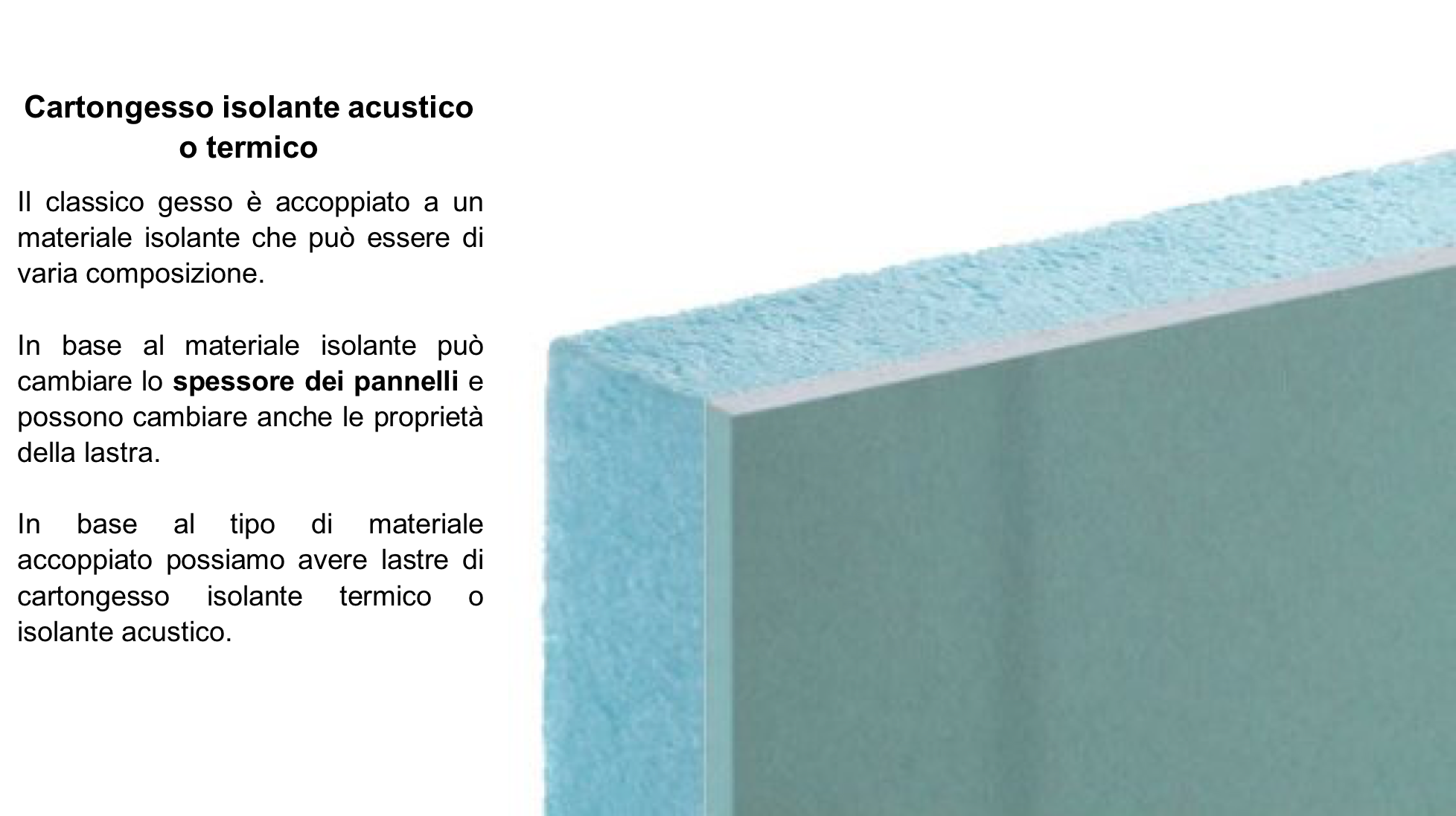 Ci sono pannelli per la tenuta e la resistenza acustica e termica. In questo caso, il pannello di cartongesso è accoppiato a materiale isolante dal punto di vista termico e, di conseguenza, anche acustico.