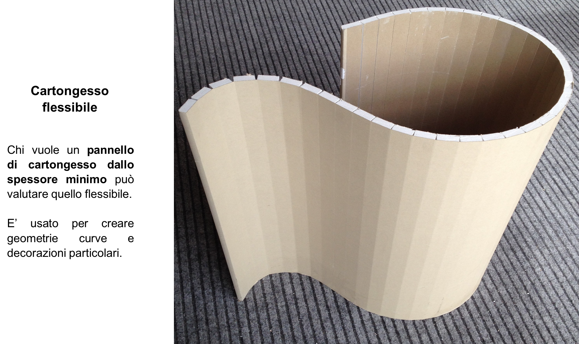 Infine, ecco la chicca, con il cartongesso flessibile. Ha uno spessore minimo ed è estremamente flessibile, grazie ai tagli nella lastra di gesso, che permettono di rigirarlo in maniera molto comoda.