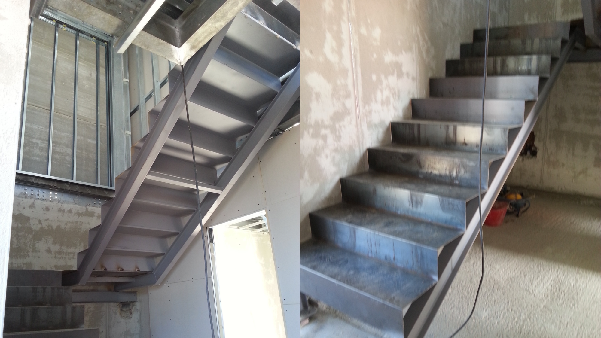 La struttura è interamente in acciaio (scala, pilastri, travi, ecc.). Una scala in metallo che si basa su una trave a ginocchio (nel nostro caso sono due travi a ginocchio), si compone essenzialmente di due parti:
