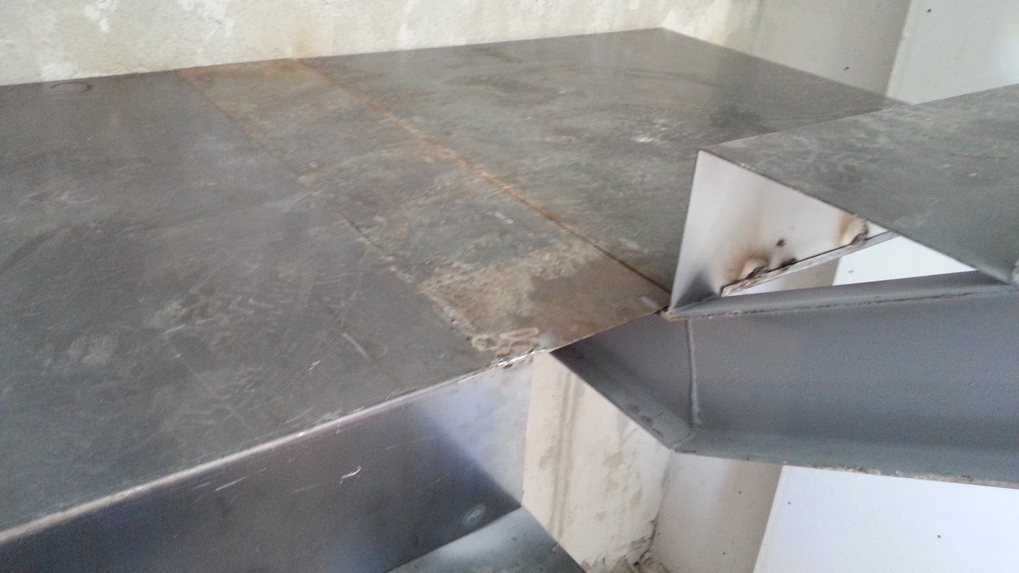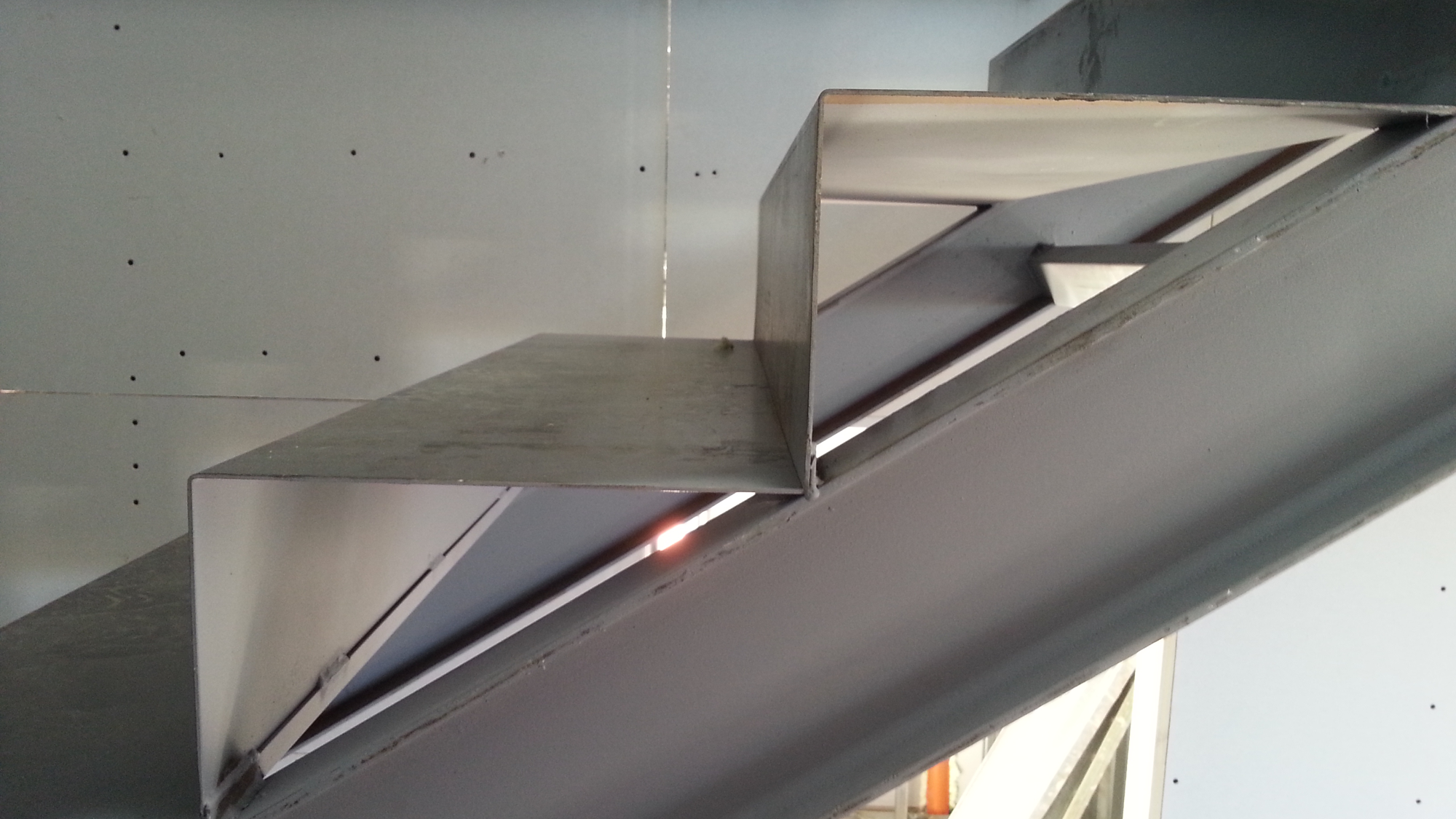 Qui vedi delle parti a sostegno della lamiera. La lamiera che forma i gradini è un unico blocco; viene fermata e saldata per evitare lo scorrimento della stessa sulla trave.