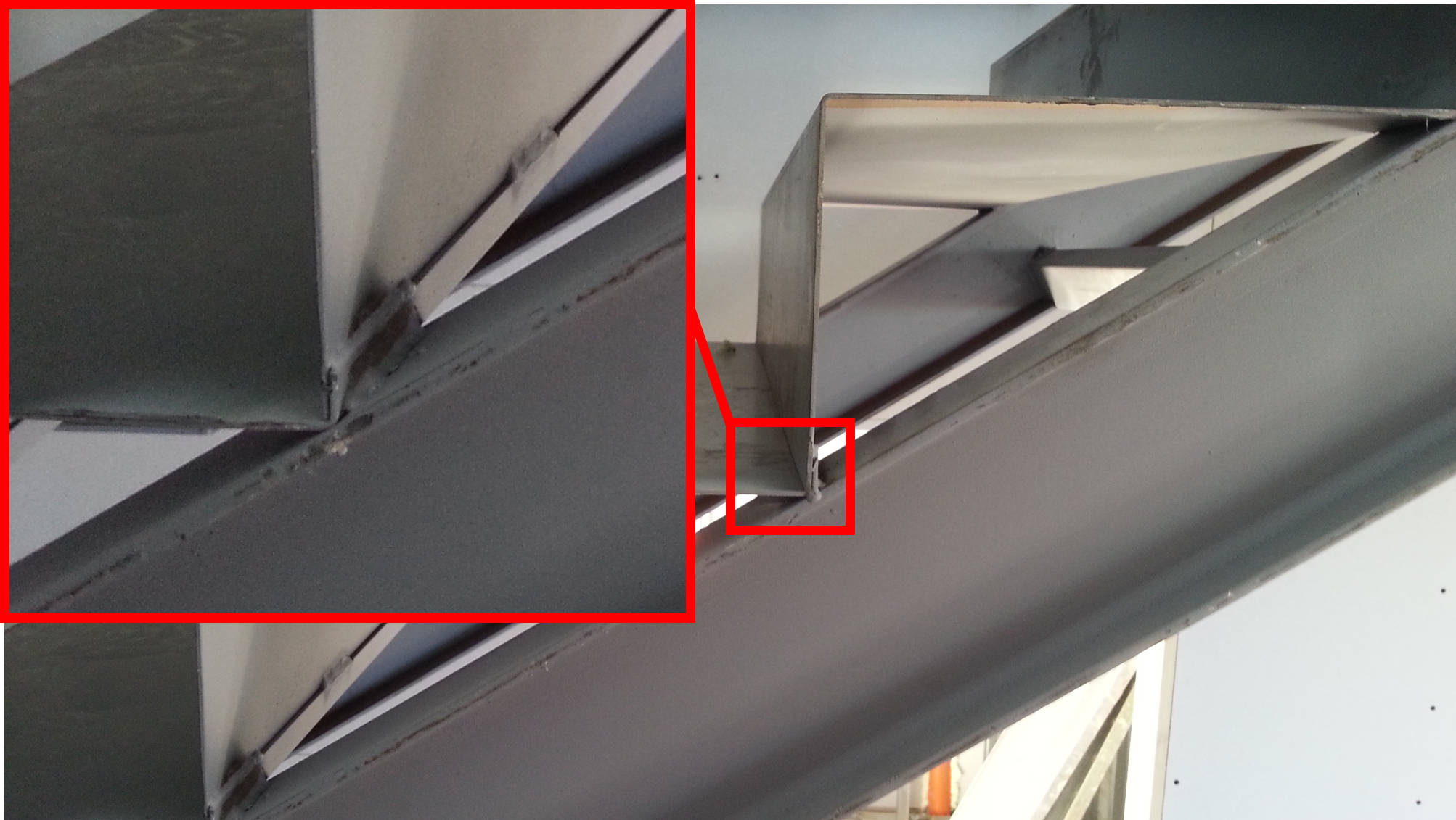 - La struttura principale, cioè la trave a ginocchio in metallo. Vi è una base che si poggia su una trave intermedia (su cui si poggia tutto il pianerottolo). Da questa trave partono altre due travi a ginocchio verso il piano superiore.